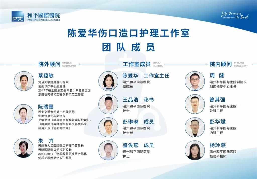 和平國際醫(yī)院陳愛華傷口造口護理工作室是浙江省首家傷口造口護理工作室。該工作室遵循醫(yī)院患者和服務對象至上的服務理念,倡導用細心撫平“傷口”,用愛心呵護“玫瑰”的服務品質與追求,該工作室在傷口造口護理人才培養(yǎng)、學科建設、專業(yè)發(fā)展等方面不斷發(fā)展,著力打造成為溫州市及浙南地區(qū)傷口造口診療護理一體化服務中心,成為省內(nèi)外傷口造口人才培養(yǎng)重要基地。