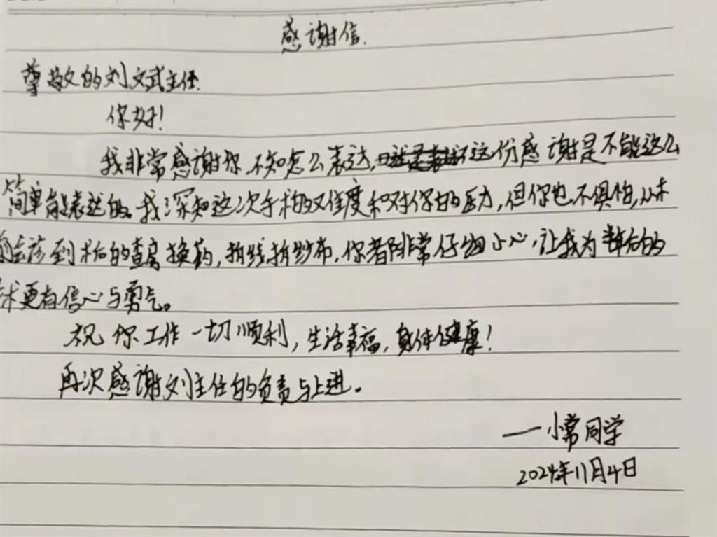 “是你們的專業(yè)和敬業(yè),讓我有了戰(zhàn)勝痛苦的勇氣和信心。”12月4日,經(jīng)過18天的術(shù)后治療與觀察,MDT專家團(tuán)隊(duì)多方面評估,初晨術(shù)后恢復(fù)良好,可以出院。出院時(shí),初晨親筆寫下兩封感謝信,交給了醫(yī)院整形外科主任劉斌和創(chuàng)傷與創(chuàng)面修復(fù)科的護(hù)士們。紙短情長,字里行間流露的真情打動了每一個(gè)人。